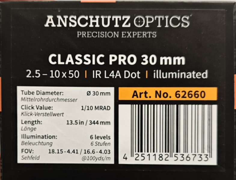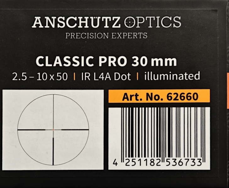 Anschütz Optics 62660 Zielfernrohr Classic PRO 30mm 2,5-10x50 IR L4A Dot illuminated