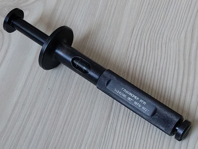 Eine Messlehre zum Überprüfen von Geschossmundlöchern (für Zünder RGM und weitere Modelle). Damit wird geprüft, ob die Füllhöhe des Explosivstoffes im Geschoss innerhalb der Norm liegt. Hersteller: Kalibr, Moskau. Dazu noch ein behelfsmäßiger Verpackungskarton aus neuerer Zeit. Seltenes Werkzeug für Depotarbeit des munitionstechnischen Dienstes.