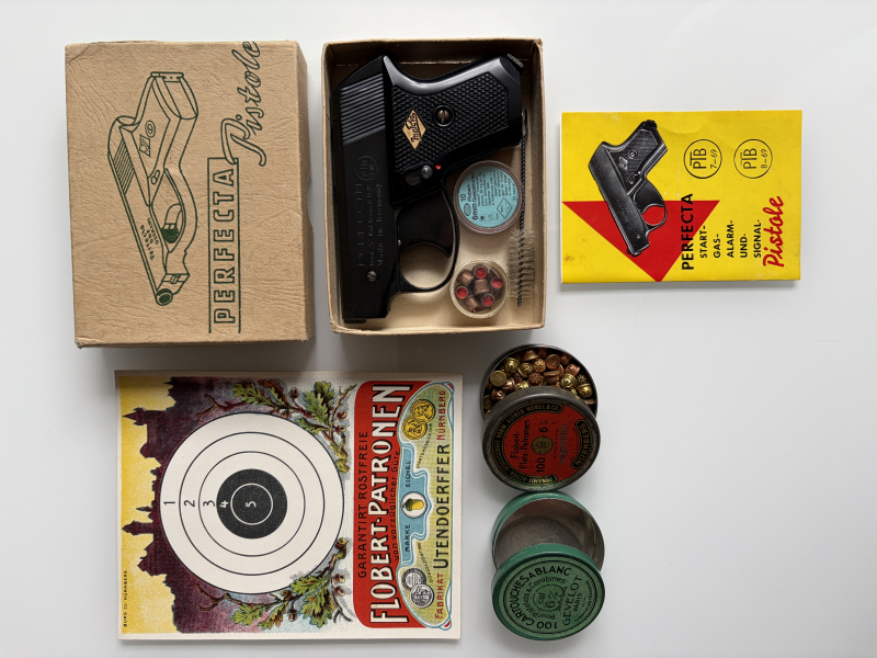 Biete eine Perfecta Mod. S Kal. 6mm D.B.P. in einem nahezu neuen ungeschossenen Sammler-Zustand inkl. diverser Flobert Munition , Dosen, original Verpackung, Anleitung und Vorkriegswerbung in Form einer Anschusskarte von Utendoerffer an, also ein komplettes Sammlerpaket. An der Waffe ist alles in einem tadellosen Zustand. Die Bilder sind Teil dieser Auktion. Da aus Privatverkauf ohne Rücknahme oder Garantie.