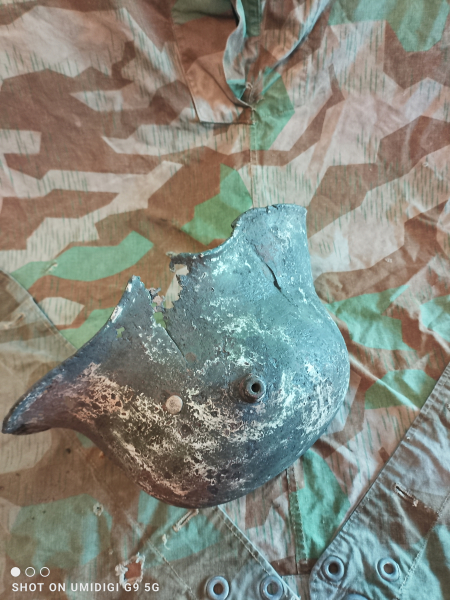 Sehr seltener und originaler Stahlhelm Modell 1918 mit Ohrenausschnitt,leider als Bodenfund in der Erhaltung,stabile Glocke mit Innenring,mit Resten von wie ich meine weißer Farbe,sicher in der Endphase des 2.Wk reaktiviert und danach entsorgt.