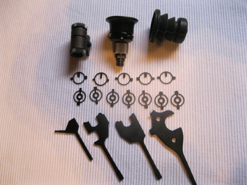 Konvolut aus Luftgewehr-Optikteilen, bestehend aus Diopterscheiben, Tunnelkorn, Korneinsätzen sowie Schlüsseln (siehe Fotos).