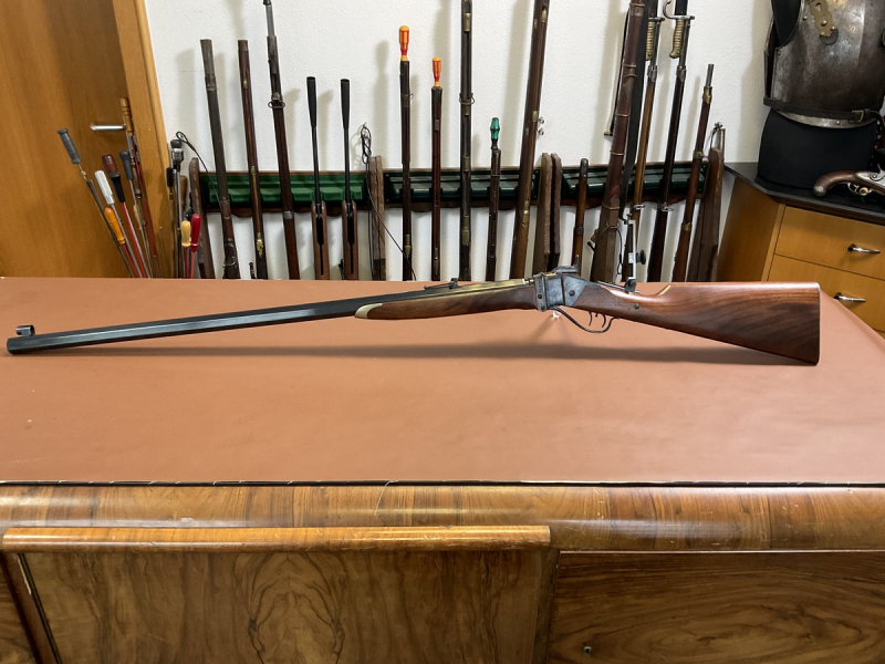 zum Verkauf steht eine Davide Pedersoli Sharps Sporting Rifle „Boss“, eine hochwertige Replik des klassischen Sharps-Einzelladergewehrs nach historischem Vorbild von 1874.