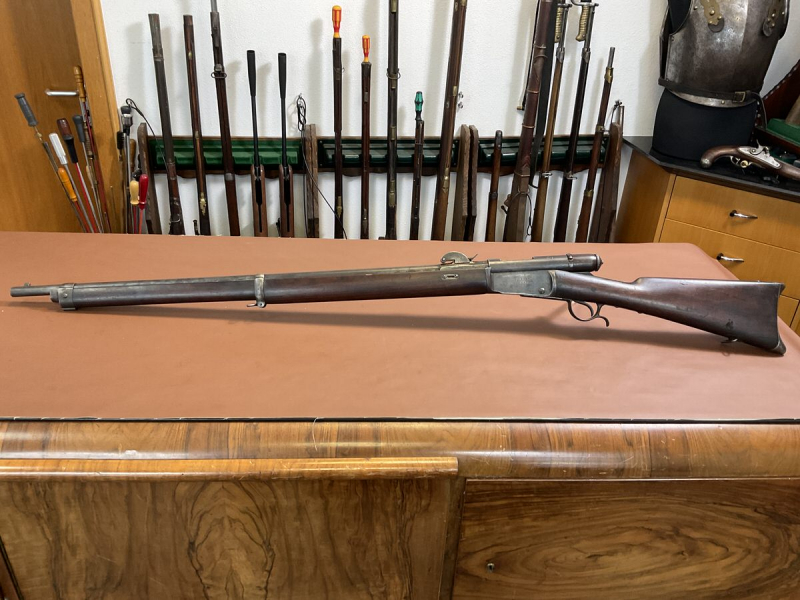 Bei der angebotenen Waffe handelt es sich um eine originale Schweizer Repetierbüchse Modell 1878 aus der Waffenfabrik Bern, eines der klassischen Ordonnanzgewehre der Schweizer Armee des späten 19. Jahrhunderts. Das Modell 1878 basiert auf dem bewährten Vetterli-System und stellt einen wichtigen Entwicklungsschritt im militärischen Repetiergewehrbau dar.