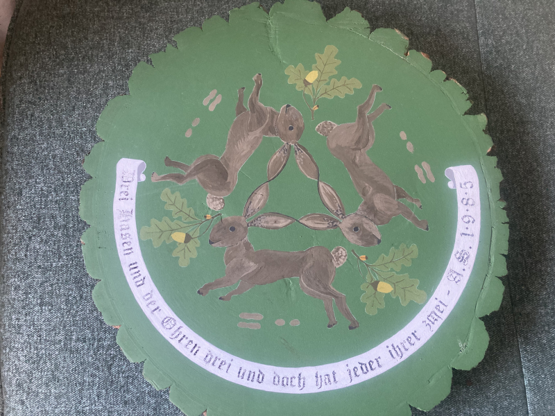 Hier kommt zur Versteigerung / Verkauf eine sehr schöne, massive von Hand bemalte Schützen-, Fest- oder Sammler Schießscheibe von Alex Schulte aus dem Jahr 1985. Titel " DREI HASEN UND DER OHREN DREI UND DOCH HAT JEDER IHRER ZWEI - A.S. 1985 " - nach alten Vorlagen. Die massive Eichenholz-Scheibe hat einen Durchmesser von ca. 55 cm und eine Stärke von ca. 4,5 cm. Es ist eine noch nicht beschossene Scheibe mit drei Hasen, drei Eichenlaub und Hasen-Spuren der Drei. Beim nächsten Schützenfest als Zielscheibe oder eine Verzierung der Jagdhütte / Jagdzimmers. Auch denke ich, es wäre ein passendes Geschenk für einen Jäger. Privatverkauf. DHL-Versand innerhalb Deutschland.