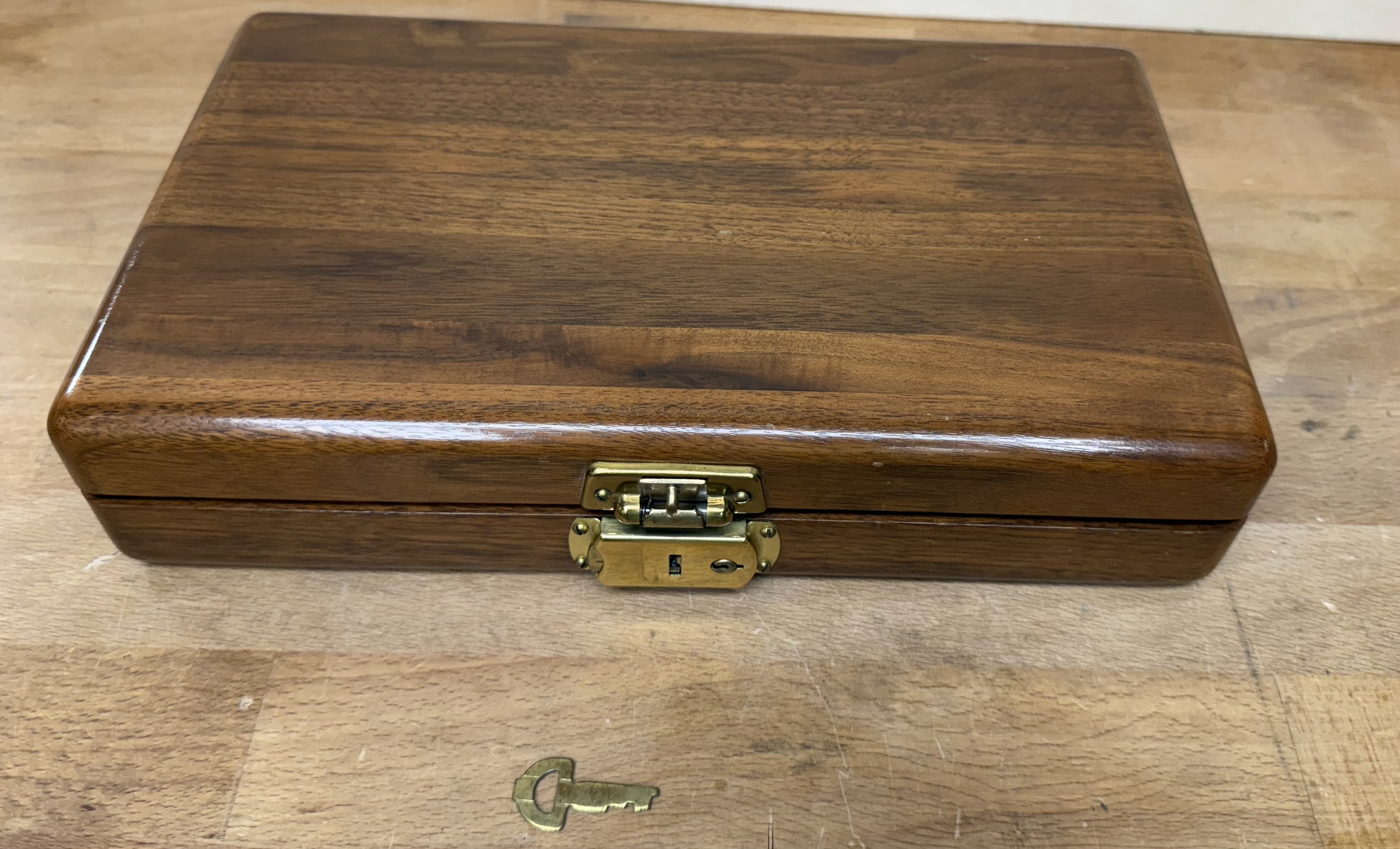 Das Setz besteht aus: Holzschatulle, passender Schlüssel, Reinigungsbürste und Visieschlüssel.