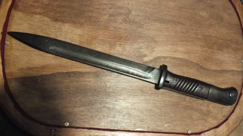 Zum Verkauf ein deutsches Seitengewehr 84/98 n. A. mit Gebrauchsspuren ( siehe Fotos!). Klinge beidseitig mit auspolierten Narben und Brünierung erneuert. Klinge mit der Serien- Nr. 7585 und Hersteller- Code 44 cul (0 = Ernst Pack& Söhne Solingen). Griffstück mit verschraubten Bakelit- Griffschalen, Drücker funktioniert perfekt! Privatverkauf ohne Gewährleistungen und keine Rücknahme.