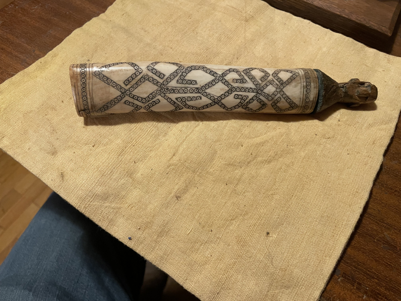 alte Pulverflasche vermutlich Afrika geschnitztes Bein Kamel oder Rind und aus Holz geschnitzter Verschluss aus Nachlass ca 22 cm lang
