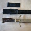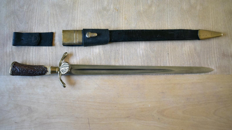 Biete einen sehr schönen historischen Hirschfänger mit Lederscheide.Herstellerzeichen müsste ein sehr altes von Weyersberg Solingen sein?Zustand siehe Bilder.Gesamtlänge 54cm.