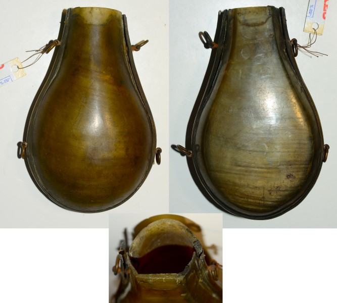 Große Pulverflasche aus Hornplatten, ringsum mit Messingschiene gefasst. Leider fehlt die Tülle samt ihrer Montage, ansonsten keine Mängel, Mitte des 19. Jahrhunderts