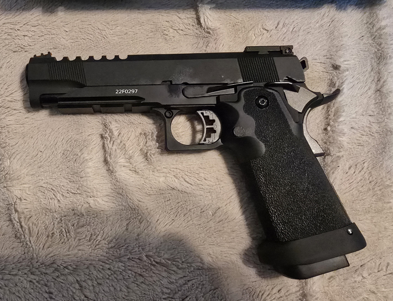 Hallo, biete hier eine AW Custom HX2702 in schwarz, 6mmBB, Gas an. Die waffe hat Blowback, hat keine gebrauchspuren, waffe ist aus Metall mit polymer body. Mit dabei ein Waffenkoffer. Was aussieht wie Flecken auf der waffe sind nur Öl Spuren von der Pflege.
