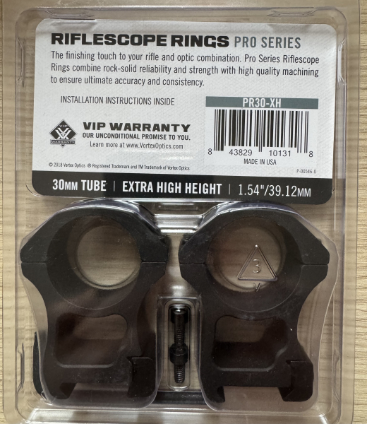 Verkaufe ein Paar Vortex Pro Series 30 mm Extra High Montageringe für Zielfernrohre (Modell PR30-XH). Die Ringe sind gebraucht, befinden sich aber in gutem Zustand, ohne Beschädigungen und voll funktionstüchtig.