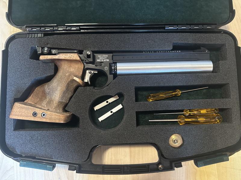 Zum Verkauf steht eine voll funktionsfähige Steyer LP5 mit Rechtsgriff Größe M/L mit neuer Kartusche ( alte Kartusche lege ich bei nicht auf dem Bild ) mit original Steyer Koffer Zubehör wie auf dem Bild zusehen.