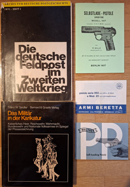 Buch "Die dt. Feldpost im Zweiten Weltkrieg" (164 Seiten). Das Buch enthält umfangreiche Spezialinformationen und befindet sich in altersbedingtem, gebrauchten Zustand. // Buch "Das Militär in der Karikatur" (184 Seiten, ISBN 3-7637-5001-6, 1982, neuwertiger Zustand) // 3 Bedienungsanleitungen für Pistolen (siehe Bild). Die Beretta- und Walther-Beschreibungen sind Originale, die Dreyse-Beschreibung ist ein Nachdruck.