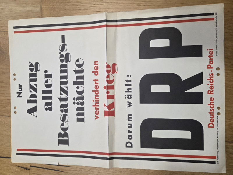 Achtung Kellerfund! Werbeplakat der DRP(Deutsche Reichs Partei) eine Partei aus den 60ern. Größe 30cm x 42cm. Stammt aus einem Nichtraucher HaushaltMehr Bilder und internationaler Versand auf Anfrage. Dies ist ein Privatverkauf deswegen keine Garantie oder Rücknahmen. Viel Spaß beim bieten!