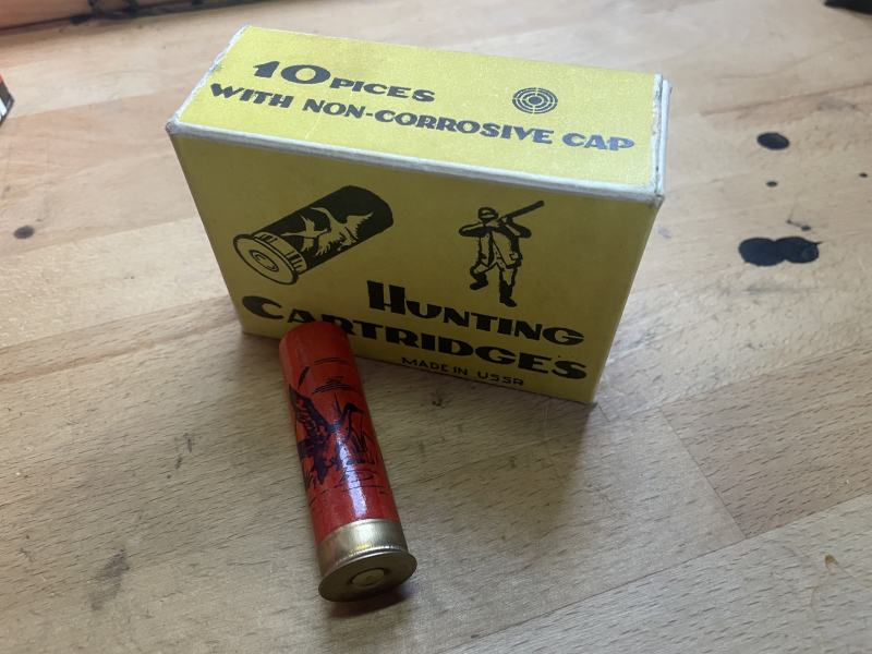 Ein 10-Schuss Karton sowjetische Schrotpatronen im Cal 16/70