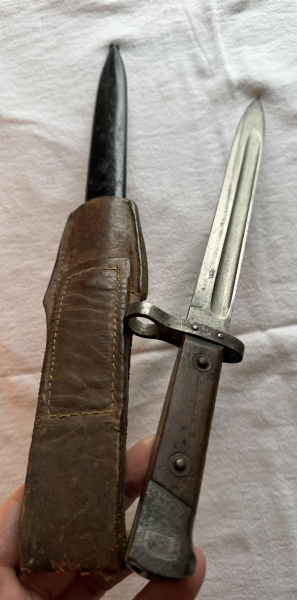 Österreich, Bajonett M 1895 aus dem 1. Weltkrieg, komplett mit Koppelschuh und mit Regimentsstempel und Waffennummer, für den Repetierer Mannlicher M 1895, Die Scheide und das Bajonett ist mit Abnahmestempela versehen. Oben am Knauf ist der sehr gut leserliche Regimentsstempel mit der Waffennummer "14 R 65.50",