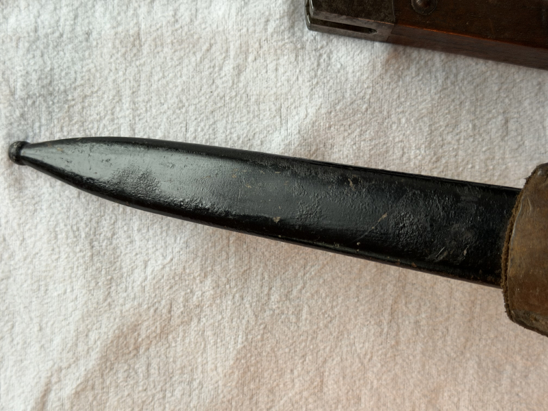 14.Inf.Regiment aus Linz , Parierstange mit Laufführungsring, Stahlknauf mit Drücker, der Drücker ist gängig, 2-fach vernietete Holzgriffschalen, auf der Klinge beidseitig eine lange Hohlkehlung, auf der Scheide ist noch zusätzliche ein Herstellerkennung Vogel&Noot , an dem Koppelschuh sind alle Nähte intakt und fest, Gesamtlänge ca. 37,5 cm,