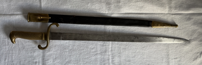 ' Somit handelt es sich dabei um ein nummerngleiches Kammerstück, welches später regimentsintern umgestempelt wurde. Griff komplett aus Messing und an einer Seite mit Griffrillierung, s-förmige Parierstange, Lederscheide mit Messingbeschlagen, auf der Klinge, die Klinge ist auf beiden Seiten mit floralen, reichhaltigen und genauen Verzierungen und mit Waffentrophäen versehen, wie Fahnen, Säbel, Trommel, usw. und die Inschrift "M. GOTT F. KAISER U. Recht" sowie der überkrönter deutsche Reichsadler. Leider sind ein paar Klopfstellen auf dem Griffrücken und auf dem oberen Scheidenblech, sonst ist das Bajonett in einem sehr schönen und unberührten Zustand, auch ist das Scheidenleder original und komplett vernäht, Leder ist auch nicht brüchig,
