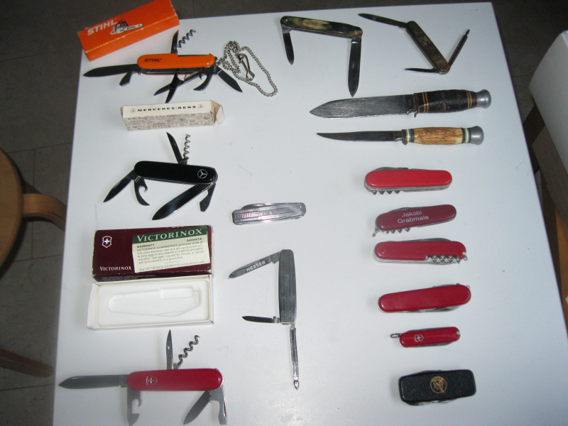Drei Taschenmesser befinden sich in der Originalverpackung (OVP): ein Taschenmesser der Marke Victorinox sowie zwei Werbetaschenmesser (Mercedes-Benz und Stihl, keine eigenen Messermarken).