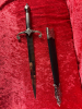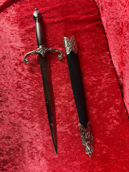 Die schwarze Scheide mit silberfarbenen Metallbeschlägen rundet das edle Gesamtbild ab und macht den Dolch zu einem attraktiven Sammler- oder Dekorationsobjekt – ideal für Vitrinen, Mittelalterfans oder Reenactment-Dekoration.