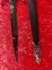• Gesamtlänge: ca. 45 cm • Gewicht: ca. 300 g • Klinge: Edelstahl (stainless), beidseitig poliert, scharf und spitz • Griff: massiv, nicht abnehmbar, mit strukturierter Oberfläche und Metallknauf • Parierstange: kunstvoll geschwungen mit floralen Ornamenten • Scheide: schwarzes Kunstleder mit silberfarbenen Zierbeschlägen oben und unten • Zustand: sehr gut, saubere Klinge mit minimalen Gebrauchsspuren