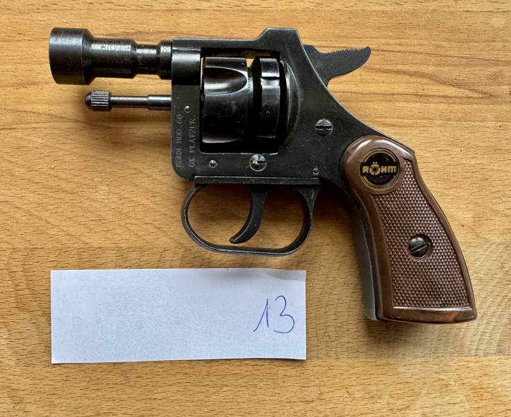 Guterhaltene leicht gebrauchte voll funktionsfähige seltener Röhm Mod. 60 cal.6mm Knall. Die Hellen Stellen sind Lichtreflexe. Noch mit vielen Stahlteilen / richtig Qualität.