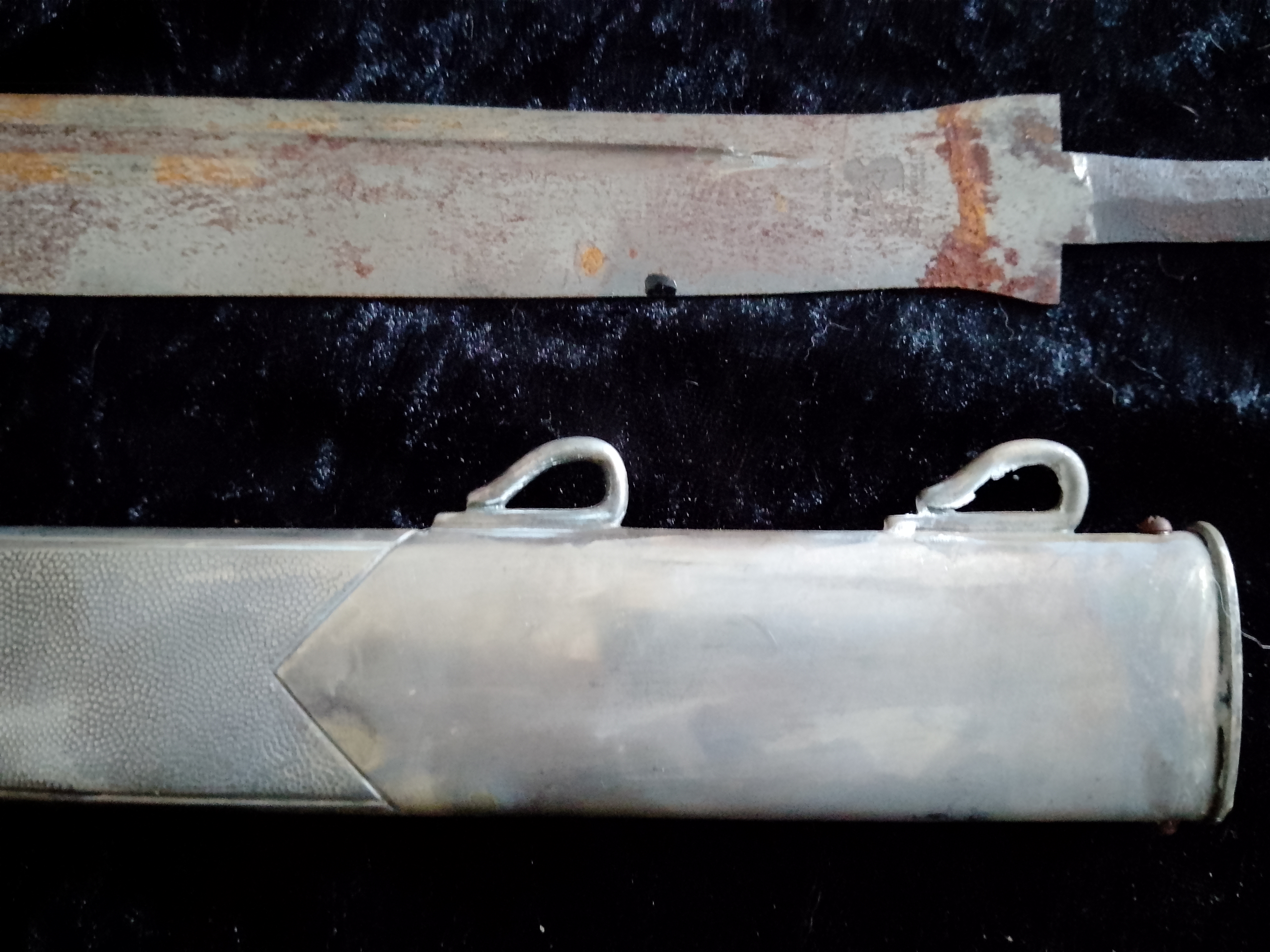 Aus Sammlungsauflösung stammen diese Ersatzteile, Klinge ist Stahl mit Korrosion für den Rad Führer Hauer mit Ätzung und Logo Eickhorn Solingen, dazu passende Scheide, beides durch Reinigung gut zu verbessern.
