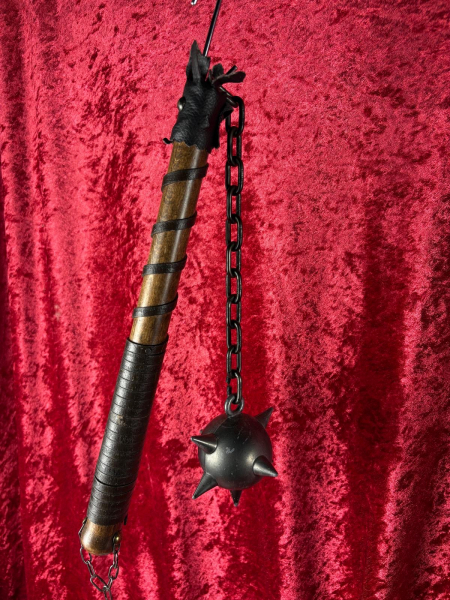 • Gesamtlänge: ca. 66 cm • Grifflänge: ca. 35 cm • Kettenlänge: ca. 20–25 cm • Kugeldurchmesser: ca. 9 cm • Gewicht: ca. 900 g • Material: Griff aus Kiefer oder Fichte, Metallkette und Kugel aus Stahlguss • Farbe: Dunkelbraun (Griff) / Schwarzmetallisch (Kugel und Kette) • Kugel: Rund, mit sechs stumpfen Spitzen (nicht scharf) • Konstruktion: Kette fest am Griff vernietet, Kugel sicher verschweißt • Griffdetails: Mit Lederwicklung und stabiler Griffkappe