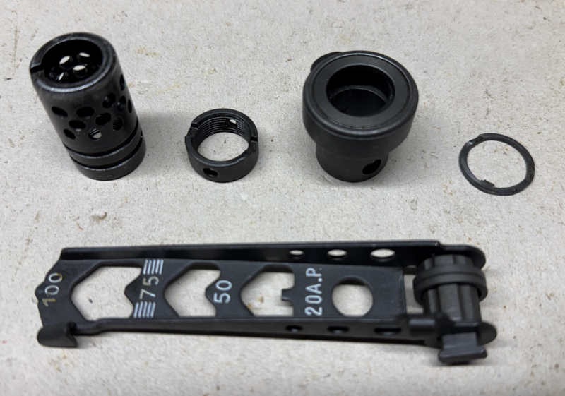 Sie bieten hier auf das abgebildete Zubehör zum französischen MAS 49/56. Es handelt sich dabei um das Visier zum verschießen von Gewehrgranaten, den Mündungsfeuerdämpfer nebst Kontermutter und Federring und das Teil, mit dem man die Aufstecktiefe auf die Waffe reguliert. Zustand wie abgebildet.
