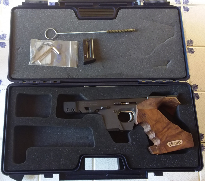 Die Waffe kommt im original Koffer mit original Zubehör, zweitem Magazin und montiertem Laufgewicht 40g wie auf den Bildern zu sehen ist.
