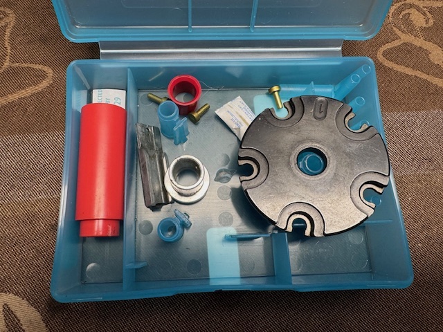 Der Kaliberkit beinhaltet eine Hülsenhalteplatte mit Fixierstiften, eine Pulvereinfüllmatrize und einige Kleinteile für das entsprechende Kaliber.