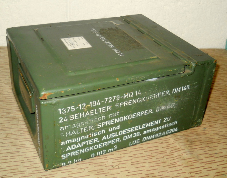 ...Beschreibung: ... seltene, luftdichte Bw Sprengmittel/Munitionskiste aus Stahlblech … mit orig. Beschriftung – gebr./ guter Zustand
