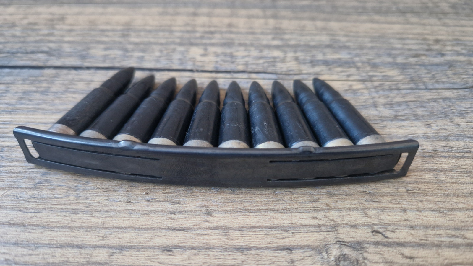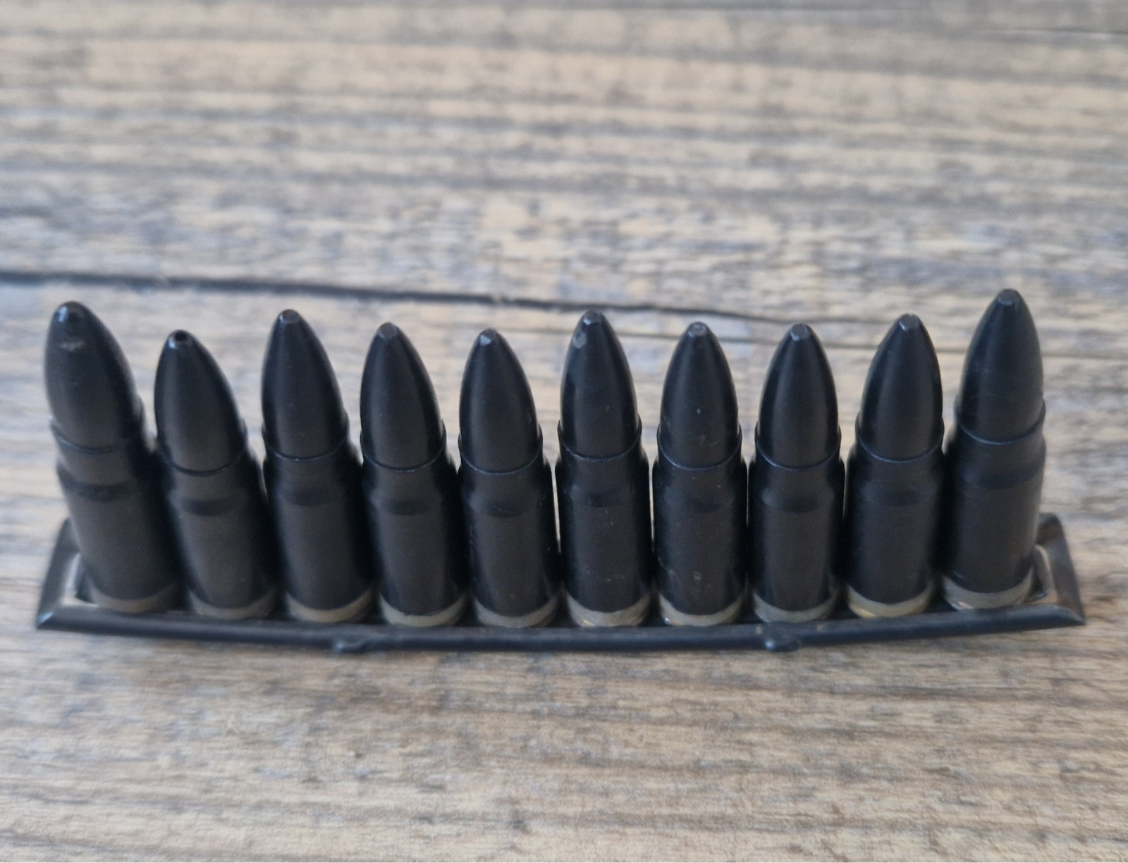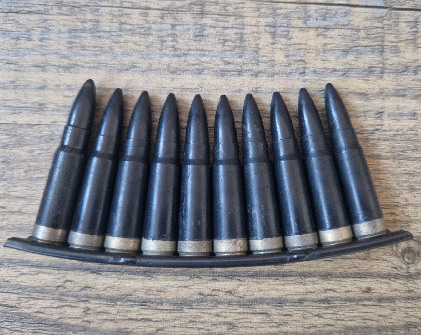NVA / DDR 10 Stück AK47 Exerzierpatronen 7,62 mm im Ladestreifen.