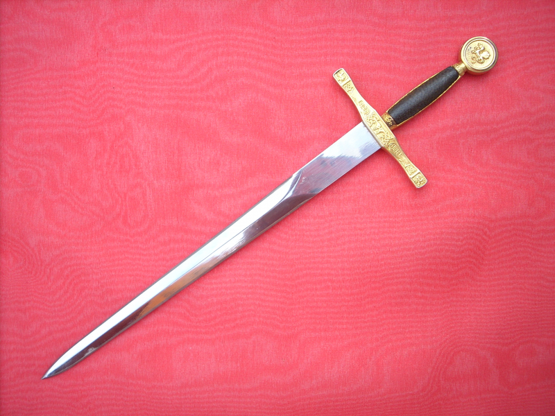 Wunderschönes, Miniaturschwert EXCALIBUR von König Arthur. Sehr aufwendige Arbeit. Griffstück beidseitig Leder, Stahlklinge, Parierstange ond Kopfschraube goldfarben und reich verziert. In der Kopfschraube auf der einen Seite der englische Drache, auf der anderen Seite Symbol bir Umschrift: EXCALIBUR KING ARTHUR. Ein tolles Sammlerstück, das sich sogar zerlegen läßt. Bitte alle Fotos betrachten, es lohnt sich ! Top Zustand, siehe Fotos, die Bestandteil der Artikelbeschreibung sind. Keine Garantie und keine Rücknahme.