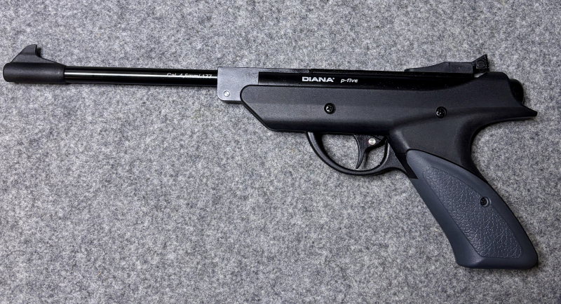 Die Diana p-five Knicklauf-Luftpistole verfügt über einen gezogenen Lauf und eine gefräste Prismenschiene zur einfachen Anbringung von Zielhilfen, eine einstellbare hintere Visierung sowie eine manuelle Sicherung. Gewicht: 920 g, Geschossgeschwindigkeit ca. 122 m ⁄ s. Die Waffe weist keine sichtbaren Gebrauchsspuren auf. Lieferung mit Bedienungsanleitung und Spannhilfe.