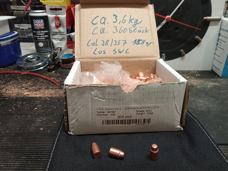 Sie bieten auf ca. 350 Los Geschosse im Kal. .357/.38 SWC. Zu Testzwecken wurde ein Teil aus der Original Packung entnommen.Der Rest ca. 3,6kg ist neu.Qualität neuwertig. Private Auktion, keine Rücknahme, keine Garantie.