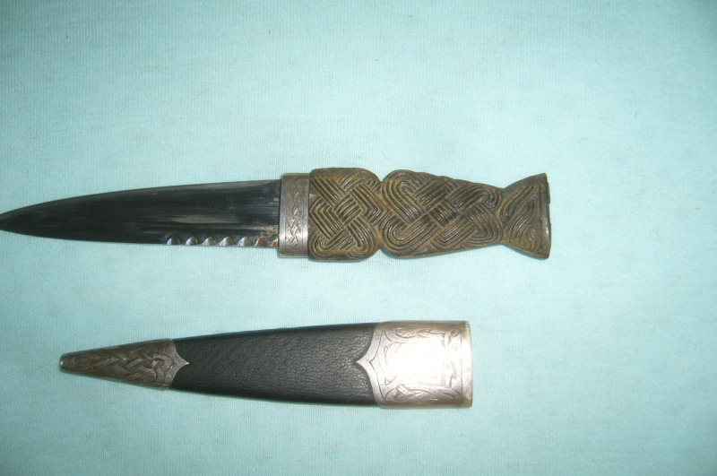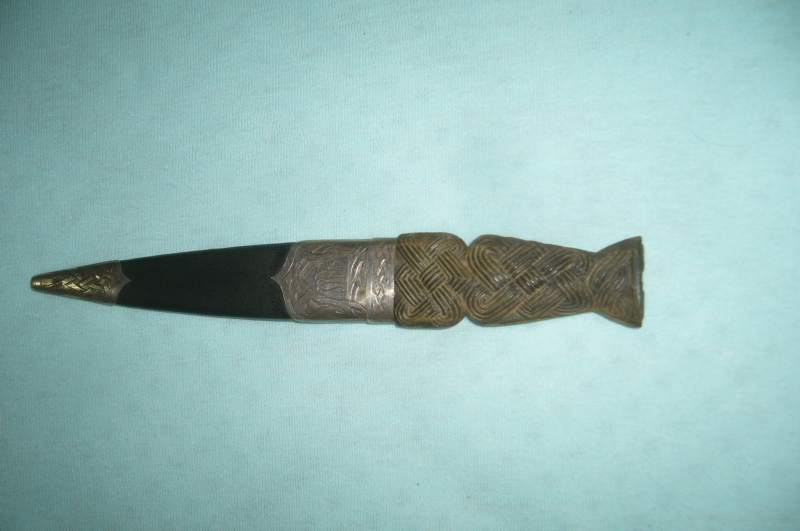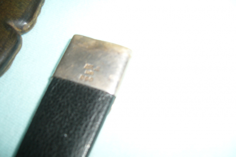 Hallo, biete ein Dolch Schottland mit Silbermontur Gestempelt, Gesamtlänge 19cm, Klinge 9cm, oben am Griff fehlt ein stück Silbermontur, siehe Foto 2.