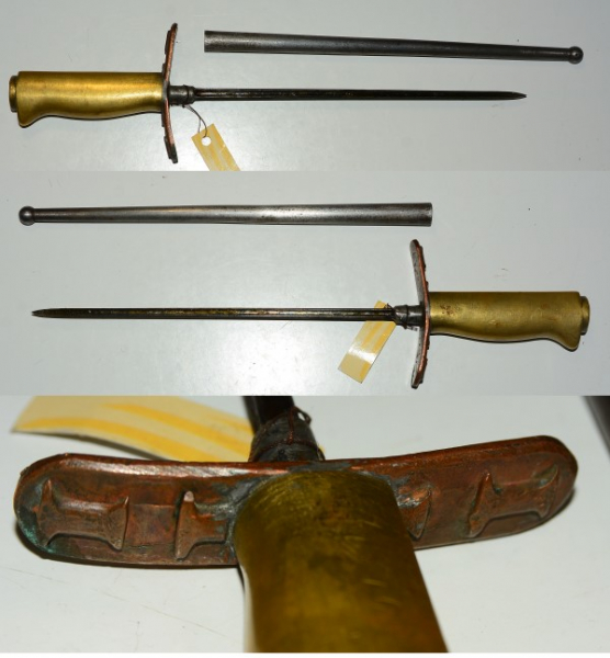 Französischer Behelfs-Gabendolch 1. Weltkrieg, Frontfertigung aus Teilen eines Lebel Bajonetts, als Parierstange Teil eines massiven Granatrings aus Kupfer einer abgefeuerten Granate, mit Scheide (Spitze einer Lebel-Scheide).