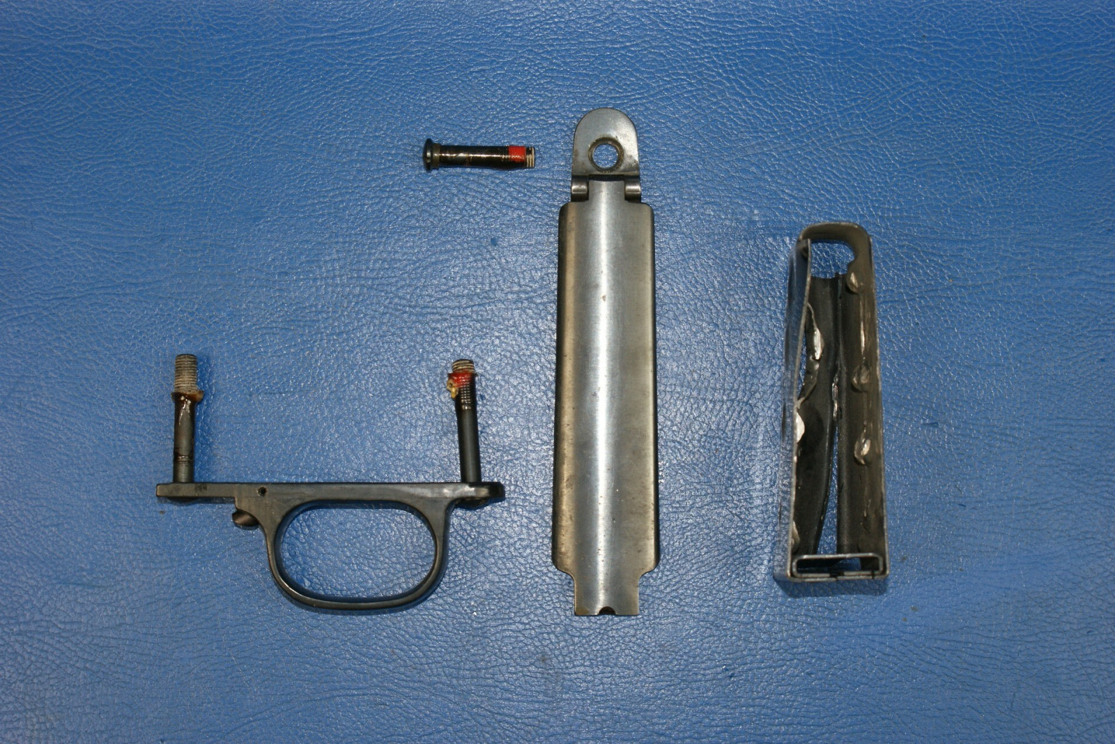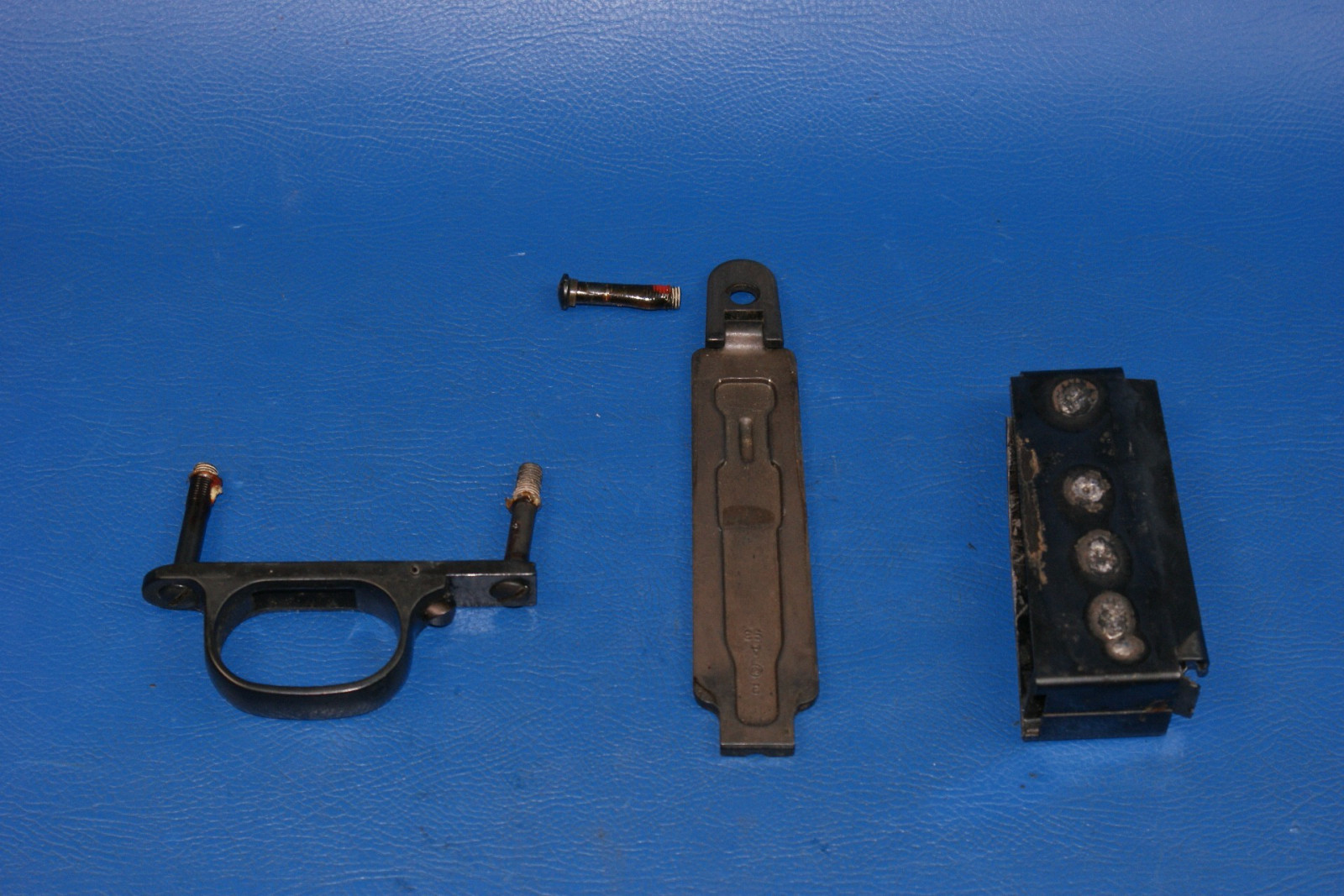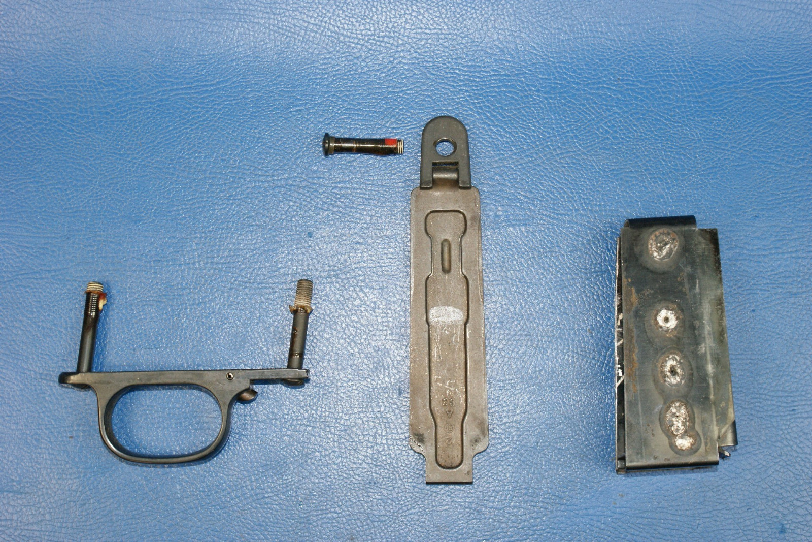 Teile mit Gebrauchsspuren und partiellem Rost. Magazin samt Zuführung beschädigt. Ursprüngliches Kaliber der Waffe .270Win.