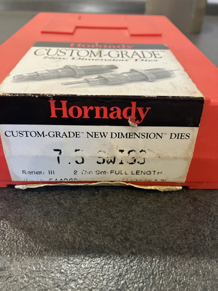 Zum Verkauf kommt hier ein gebrauchter 7,5x55 Hornady Matrizensatz mit Vollkalibiermatrize, wie auf dem Bild zu sehen mit Hülsenhalter.