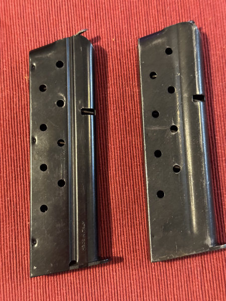 Beide Magazine passen in ein Griffstück von einer Colt 1911 A1, beide Magazine sind gebraucht,Zustand siehe Bilder.