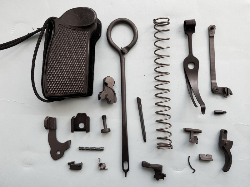 Auszieher, Auszieherbolzen, Auszieherfeder, Visier, Schlagbolzen, Sicherungsfeder, Sicherung, Abzugstollen, Abzugstollen- u. Schlittenfangfeder, Hahn, Abzugstange, Hahnhfeder, Griffschalenschraube (NVA), Griffschale NVA schwarz mit Fangschnur (gebraucht), Hahnfederhalter, Schlittenfanghebel, Abzug, Vorholfeder, Putzstock