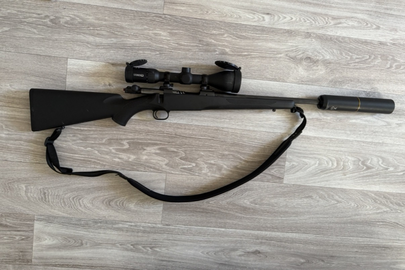 Dabei sind Gewehrriemen, Schalldämpfer der Marke Stalon, sowie Zielfernrohr der Marke Steiner mit Schutzklappen.