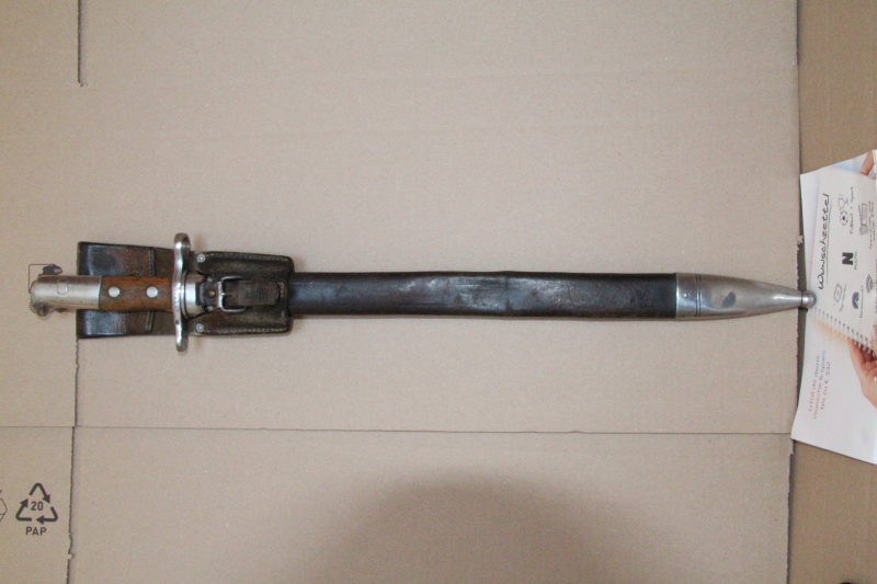 Schweiz M14 Hersteller:Waffenfabrick Neuhausen in Lederscheide,Klinge und Säge scharf ohne Kerben,Drücker ok,Lederscheide getragener Zustand,Naht geschlossen,Ort und Mundblech ohne Dellen,Koppelschuh getragener Zustand,Hersteller nicht lesbar.