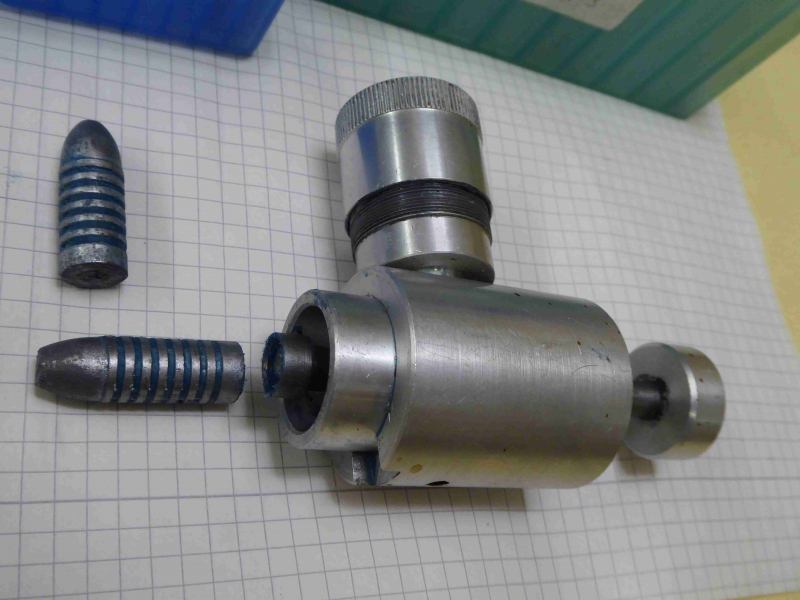 Kaliber 451-----Geschoßfetter aus Aluminium und Zubehör-----1 Stück Geschoßfetter für Kaliber 451 aus Aluminium----Länge ca.11 cm, Durchmesser ca. 4 cm , Durchmesser für Fettkammer ca. 3 cm-----1 e Kunststoff-Box mit 20 Pulverröhrchen aus Kunststoff----1 e Geschoß-Box für 50 Stück Geschoße und 14 Bleigeschoße-----