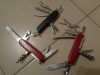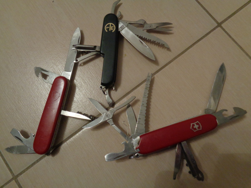 Drei Schweizer Taschenmesser in soweit gutem Zustand , bei dem großen ist auf einer Seite ein Stück der Schale abgebrochen , Bilder beachten !
