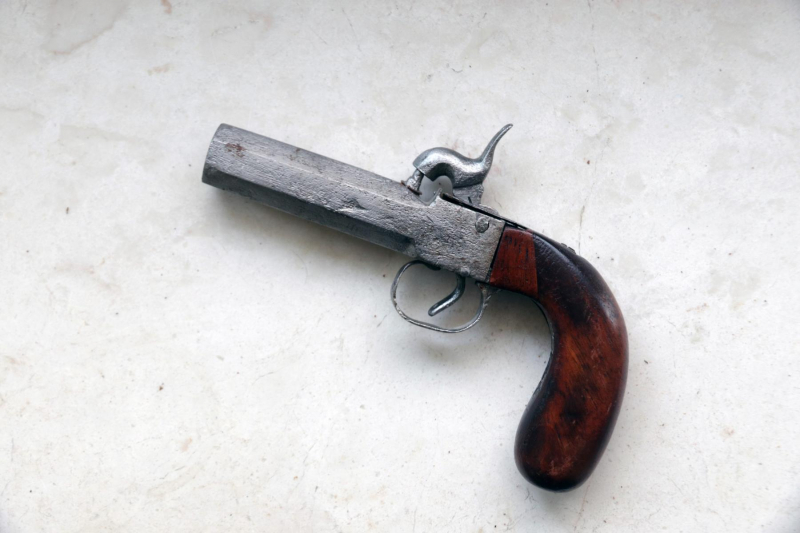 Alte Perkussionspistole ca. 1870 mit 8-eckigem Lauf, Länge 17 cm, Lauflänge 7,5 cm