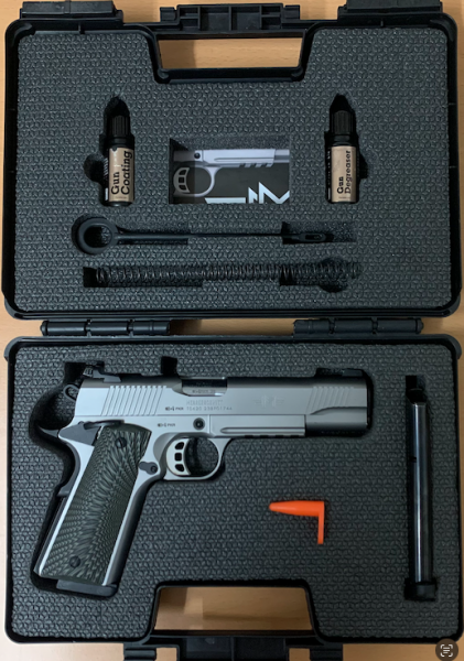 Biete meine 1911 ME1911 Messerschmitt im Kaliber 9x19 aus dem Hause Waffenschuhmacher mit 2 Magazinen zum Verkauf an. Die Waffe ist mit einer einstellbaren LPA-Visierung ausgestattet und hat eine Schussbelastung von ca.1500 Schuss.