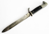 Seitengewehr S 84/98 Bajonett der Wehrmacht II. WK: Wasserfund meines Vaters Mitte bis Ende der 40-er Jahre. Die vernickelte Zink-Griffmontierung hat dadurch etwas gelitten. In provisorischer vernieteter Lederscheide mit Druckknopfverschluss. Am originalen schwarzen Bekelit-Griff ist ein minimaler halbrunder Ausbruch von 15 x 2,5 mm.