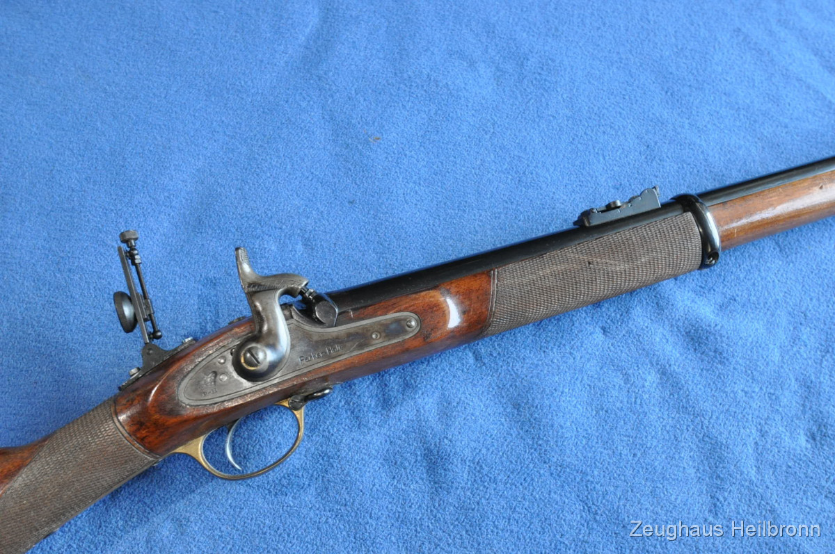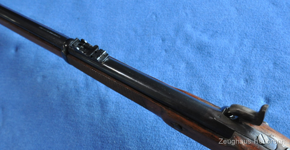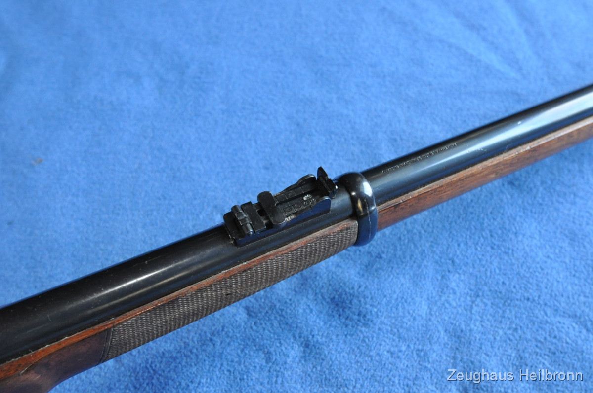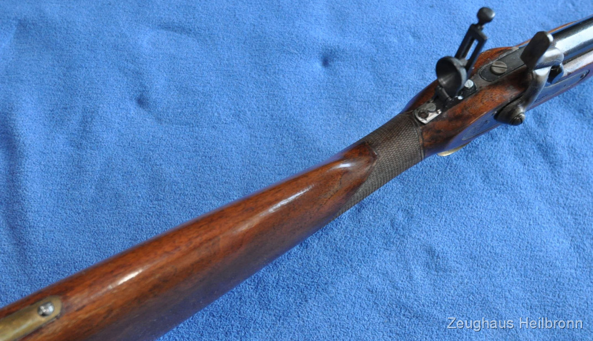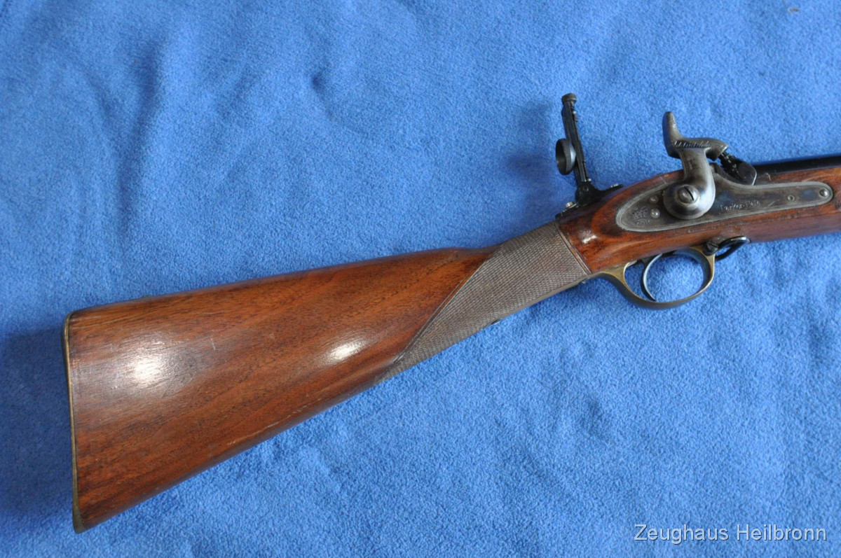 Waffe in einem schönen Zustand mit leichten Gebrauchsspuren am Schaft, Brünierung sehr gut, siehe Bilder, mechanisch voller Funktion, Lauf sehr gut. Mit Diopter. Hochwertige Fertigung aus England.